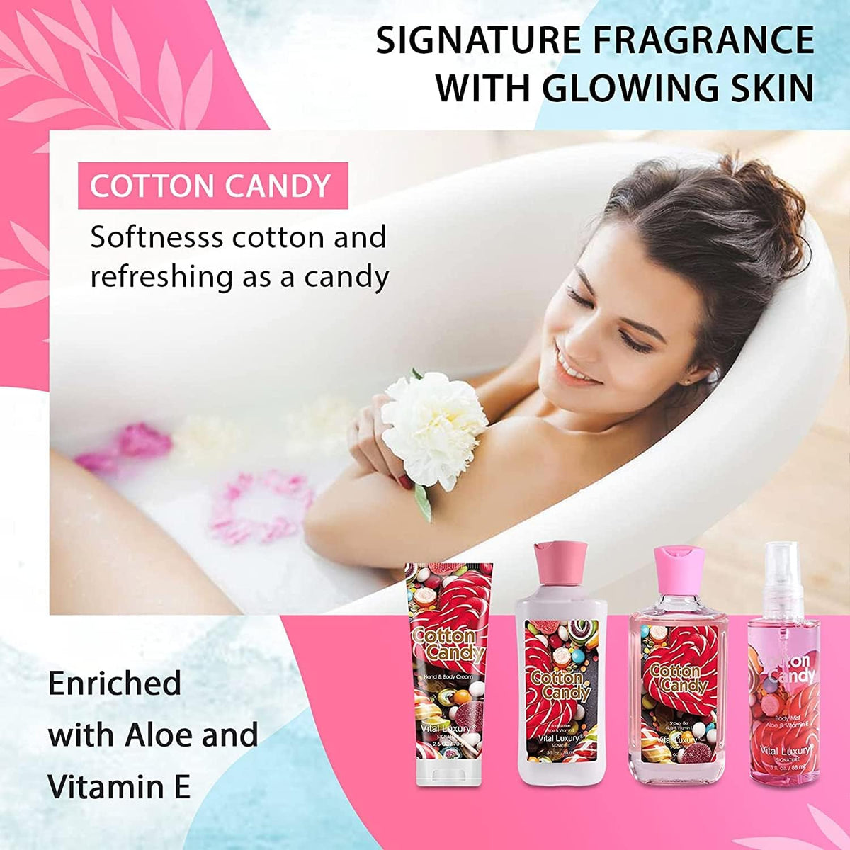 - Q: What products are included in the Vital Luxury Cotton Candy Bath & Body Kit? A: The Vital Luxury Cotton Candy Bath & Body Kit includes four essential items: Body Lotion, Shower Gel, Body Cream, and Fragrance Mist, all designed to nourish and rejuvenate your skin.