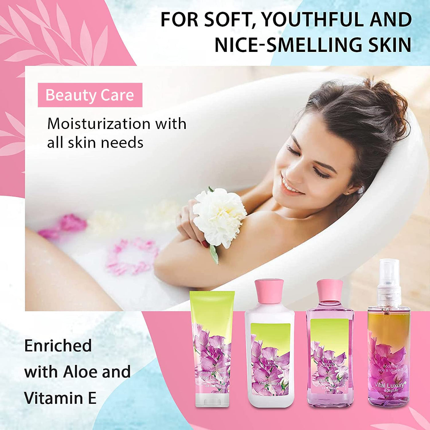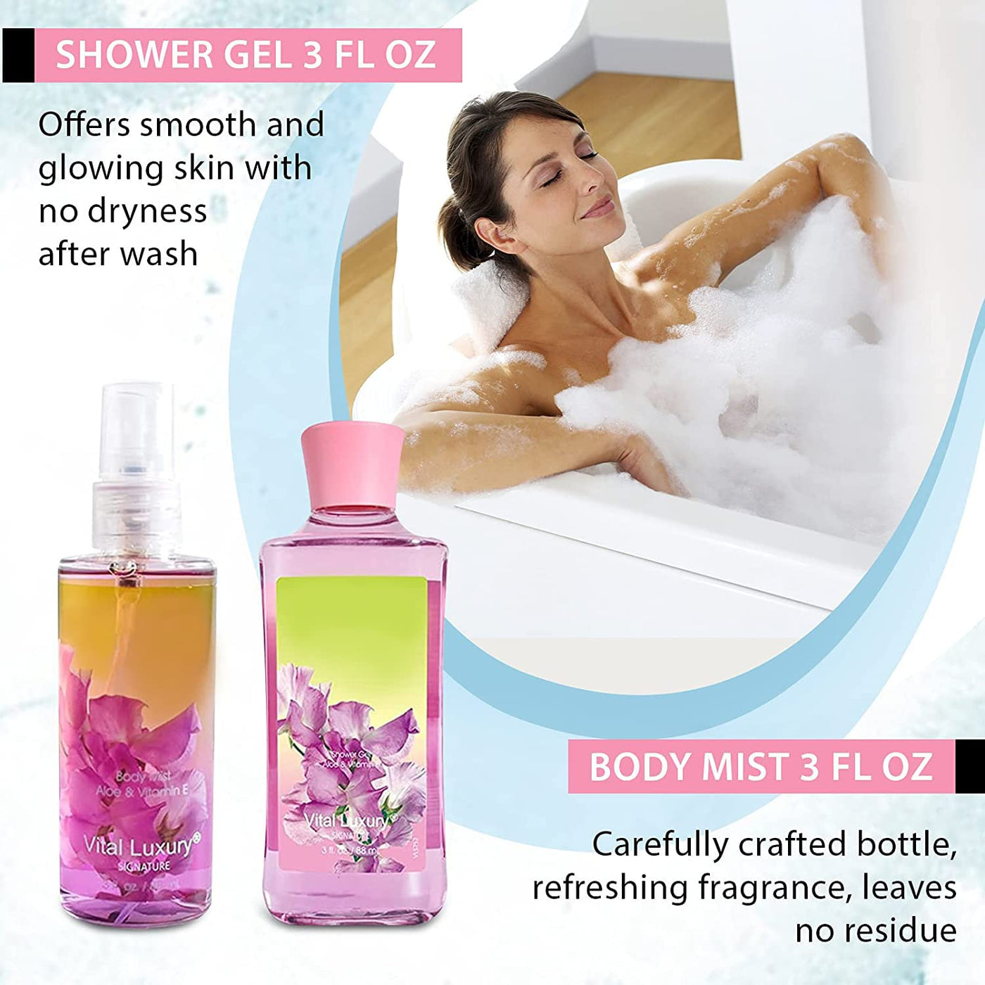 - Q: What benefits do the natural extracts in this kit provide? A: The natural extracts in the Vital Luxury products, such as Aloe and Vitamin E, help keep the skin hydrated, smooth, and mildly fragrant, ensuring long-lasting freshness and nourishment.