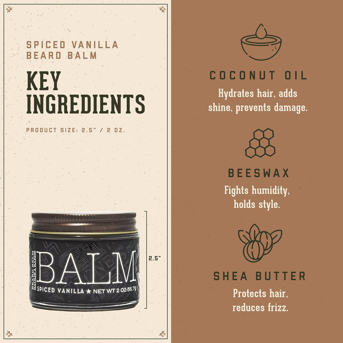 - Q: What is the scent profile of the beard balm? A: The beard balm features a masculine aroma that combines a hint of spiced vanilla with a signature sweet tobacco scent. This unique blend includes notes of ginger, clove, coconut, amber, star anise, woods, and musk, providing a pleasant fragrance that lasts throughout the day.