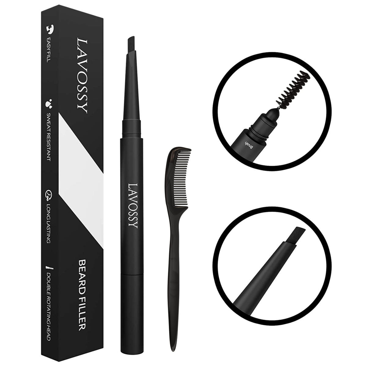 - Q: How do I use the Lavossy Beard Pencil for the best results? A: To use the Lavossy Beard Pencil, start by creating hair-like strokes in the direction of your hair to fill in gaps. Then, use the included blending brush to blend and achieve your desired look. For optimal results, allow 30 minutes for the product to settle into your beard.