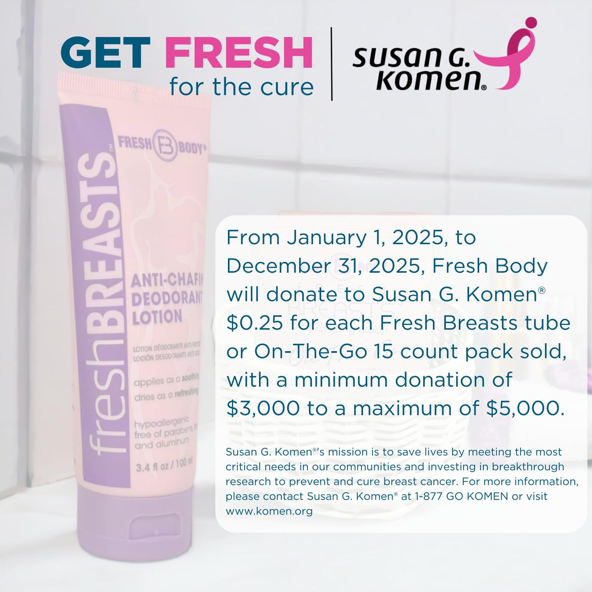 - Q: What makes Fresh Body unique compared to other anti-chafing products? A: Fresh Body Fresh Breasts stands out due to its lotion-to-powder formula, which eliminates the mess often associated with traditional powders. Additionally, it is free from harmful ingredients like aluminum and parabens, and each purchase supports breast cancer research through donations to Susan G. Komen.