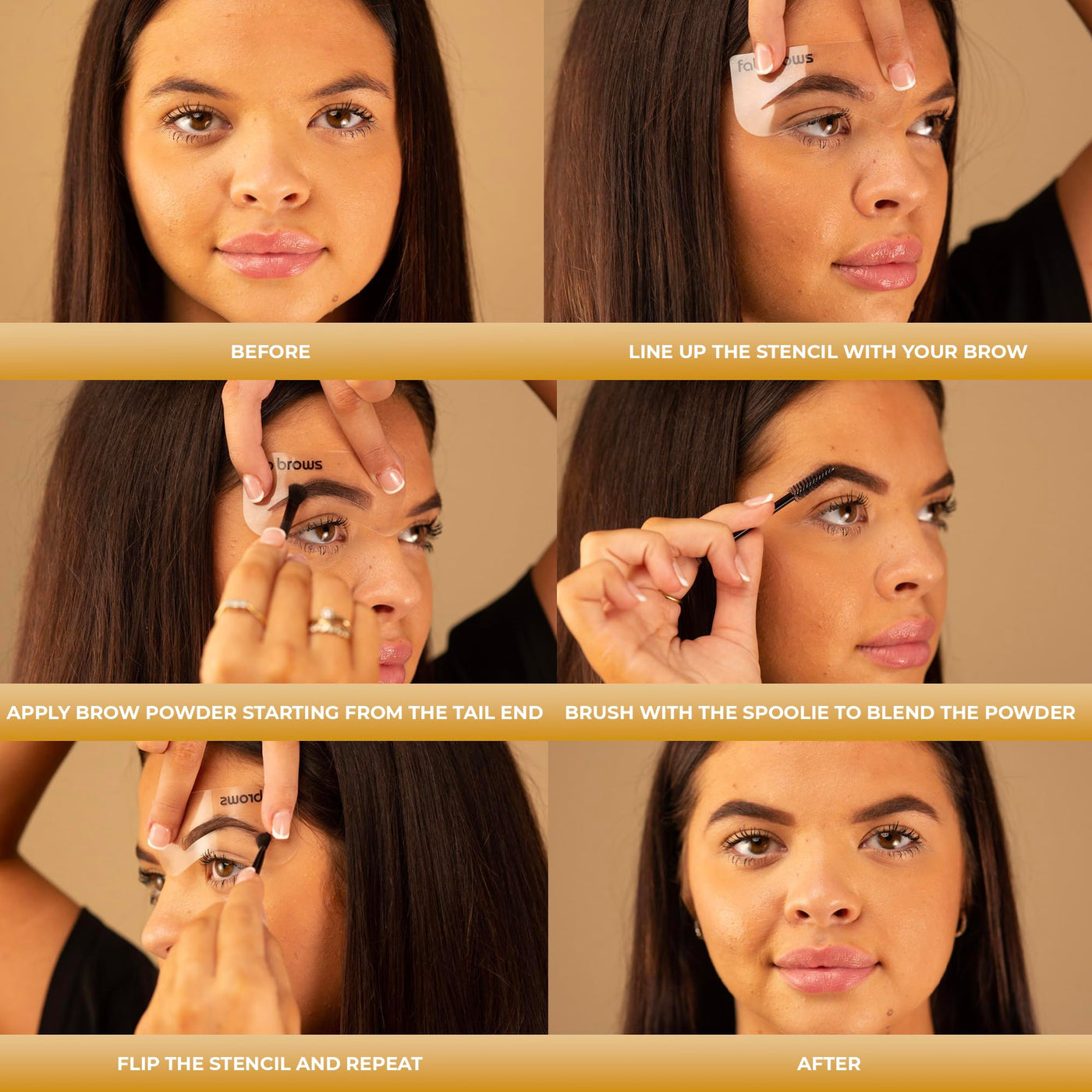 - Q: What is included in the Fab Brows Duo Eyebrow Kit? A: The Fab Brows Duo Eyebrow Kit includes a waterproof eyebrow powder, six reusable eyebrow stencils, a dual-ended brush with handle, a magnifying mirror, and a palette of tones to help you shape your brows perfectly.