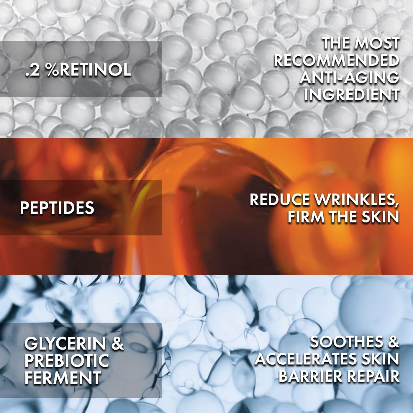 - Q: What are the main ingredients in this serum? A: The serum contains zero point two percent pure retinol, peptides, and prebiotic ferment, making it effective for anti-aging.