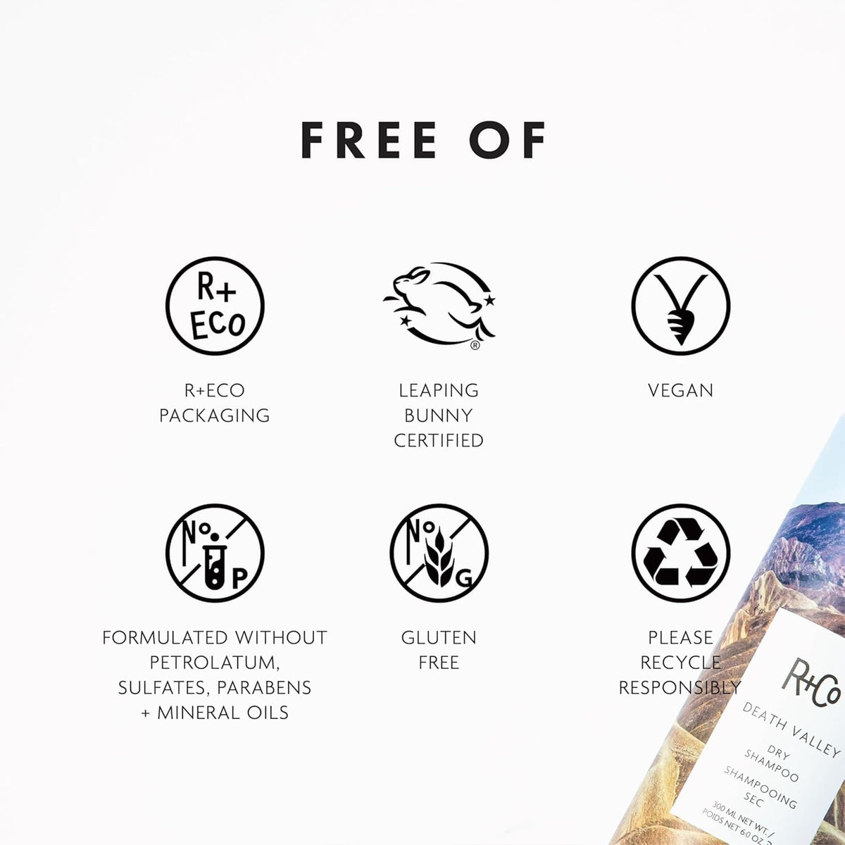 Product Description Absorbs And Removes Excess Oil While Building Volume And Texture. Death Valley Dry Shampoo Is Vegan And Cruelty Free Shampoo. Good For Easy, Big, Messy Bardot Hair. Brand Story R+Co Is A Collective Of Some Of The Most Knowledgeable Hairstylists That Have Come Together To Make A Line Of Products. Modern Formulations Offer Immediate Results, Embodying Experimentation, Design, Artistry, And Passion.