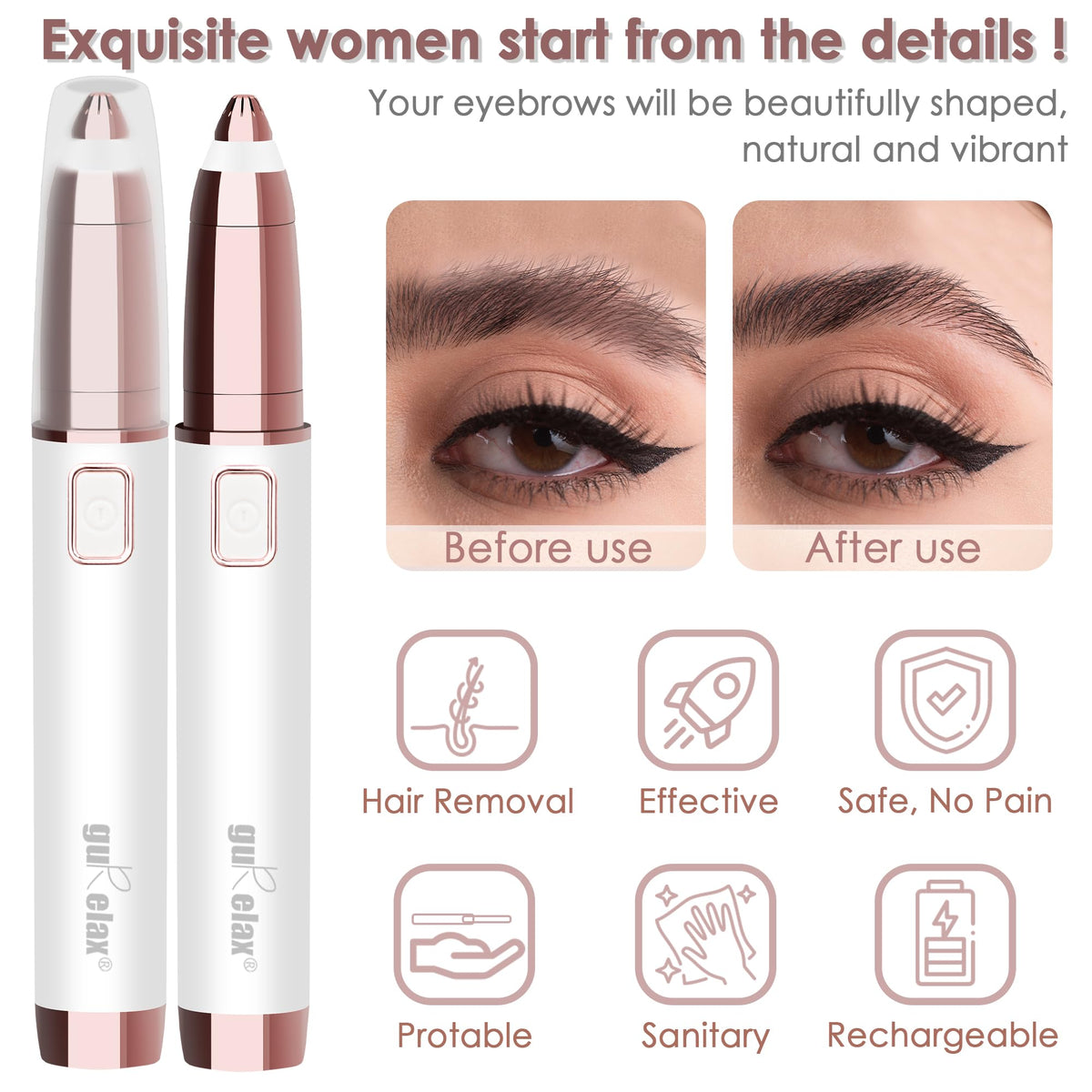 - Q: How does the Gurelax Eyebrow Trimmer work? A: The Gurelax Eyebrow Trimmer features a precision tip designed to remove unwanted eyebrow hair painlessly. Simply pull the skin tight and move the trimmer in a circular motion over the targeted areas for effective results.