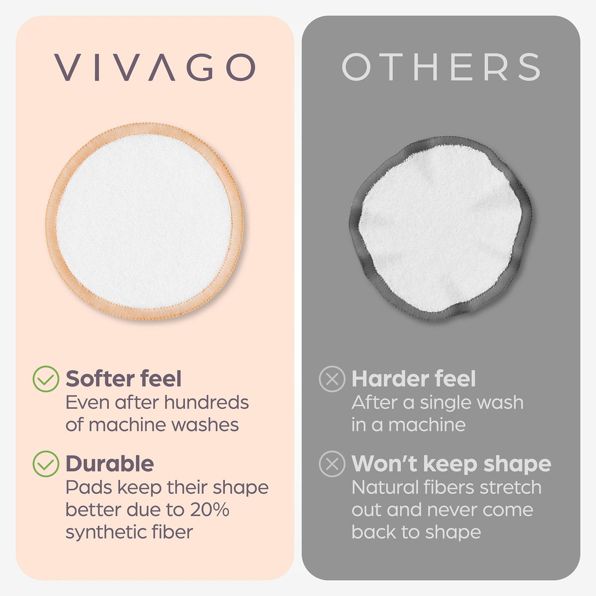 - Q: How do I use the VIVAGO reusable cotton rounds? A: Simply apply your favorite makeup remover or cleanser to the cotton round and gently wipe your face. After use, wash the rounds in the laundry bag provided.