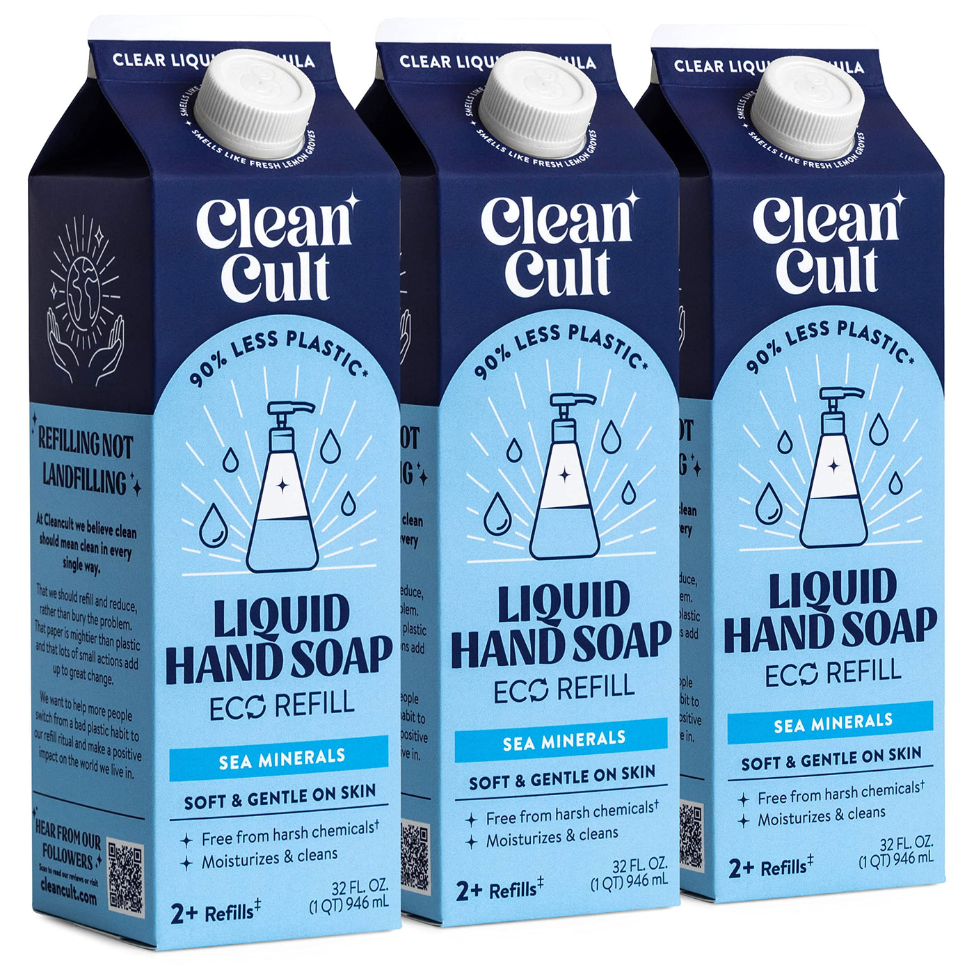 - Q: What is the size of each Cleancult hand soap refill? A: Each Cleancult hand soap refill is thirty-two fluid ounces. The product comes in a pack of three, providing a total of ninety-six fluid ounces.