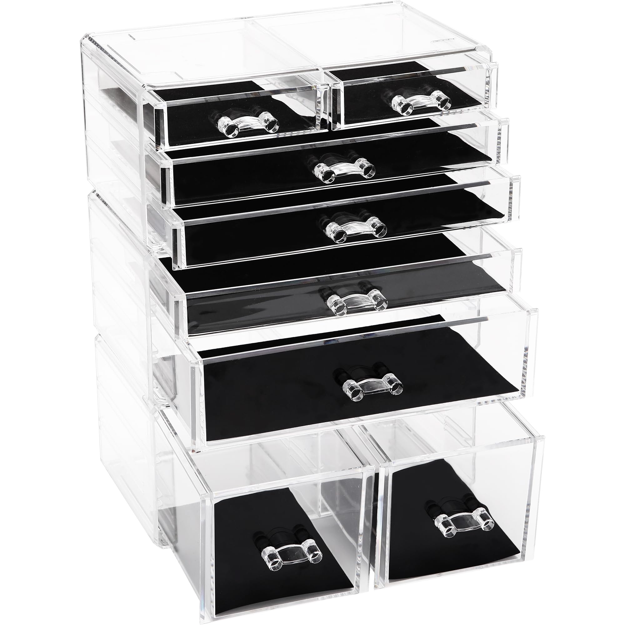 Keep Your Vanity Clutter-Free With This Makeup Organizer That Offers A Perfect Storage Solution For Your Cosmetics And Accessories. This Transparent Makeup Case With Black Flocked Cloth Allows Easy Visibility Of Your Items And Creates An Appealing Display That Coordinates With Any Decor. With One Large And Two Small Drawers, You Can Store All Your Beauty Essentials In One Convenient Place. The Makeup Organizer Is Practical And Functional, Equipped With Joints That Allow You To Stack It As Per Your Needs While Keeping Stability. No Assembly Is Required, Making It Even Easier To Use. The Sturdy And Durable Acrylic Plastic Construction Ensures That This Makeup Organizer Is Built To Last. The Drawers Slide Open Smoothly, And The Easy-Grip Handles Make Them Effortless To Use. This Organizer Is Versatile Enough To Suit Any Storage Needs From Cosmetics To Jewelry. It Is An Ideal Storage Solution For Makeup Lovers Or Fashion Enthusiasts Looking To Streamline Their Daily Routine.