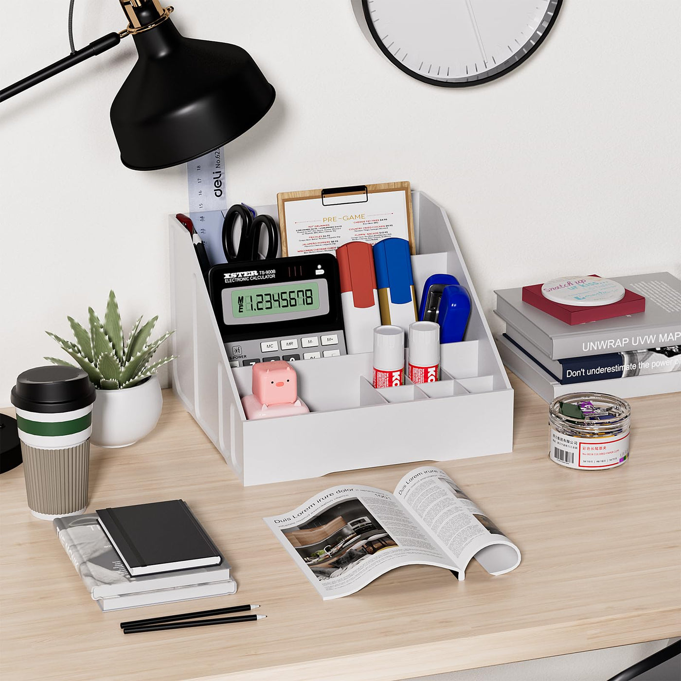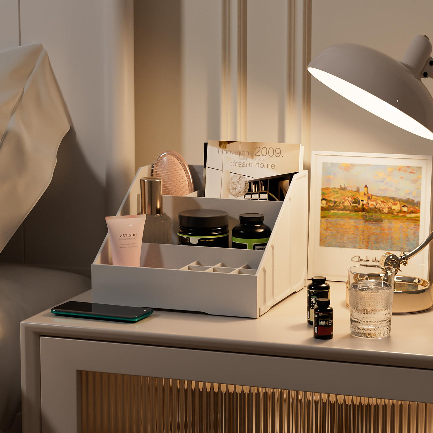 White Makeup Organizer For Vanity With 6 Lipstick Organizer,1 Makeup Brush Holder,3 Different Sized Compartments For Nail Polish