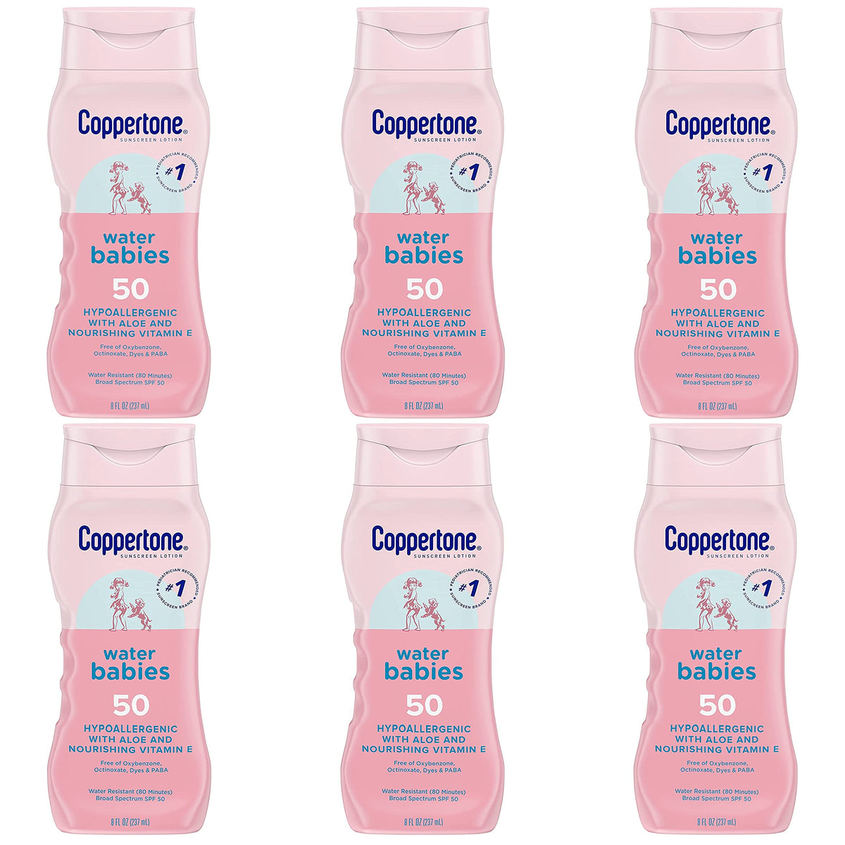 6 Pack of Coppertone Water Babies Sunscreen Lotion with SPF 50, 8 fl oz. A hypoallergenic and gentle sunscreen lotion that protects your baby's skin from the sun with a water resistant formula that's dermatologically tested and free of PABA, dyes, octinoxate, and oxybenzone. The hypoallergenic, gentle, and non irritating formula also contains aloe and nourishing vitamin E. The formula is made to protect baby's skin form up to 98% of the sun's most damaging UV rays. Apply whenever fun takes you outside, whether it's a day at the beach or playing by the pool.
