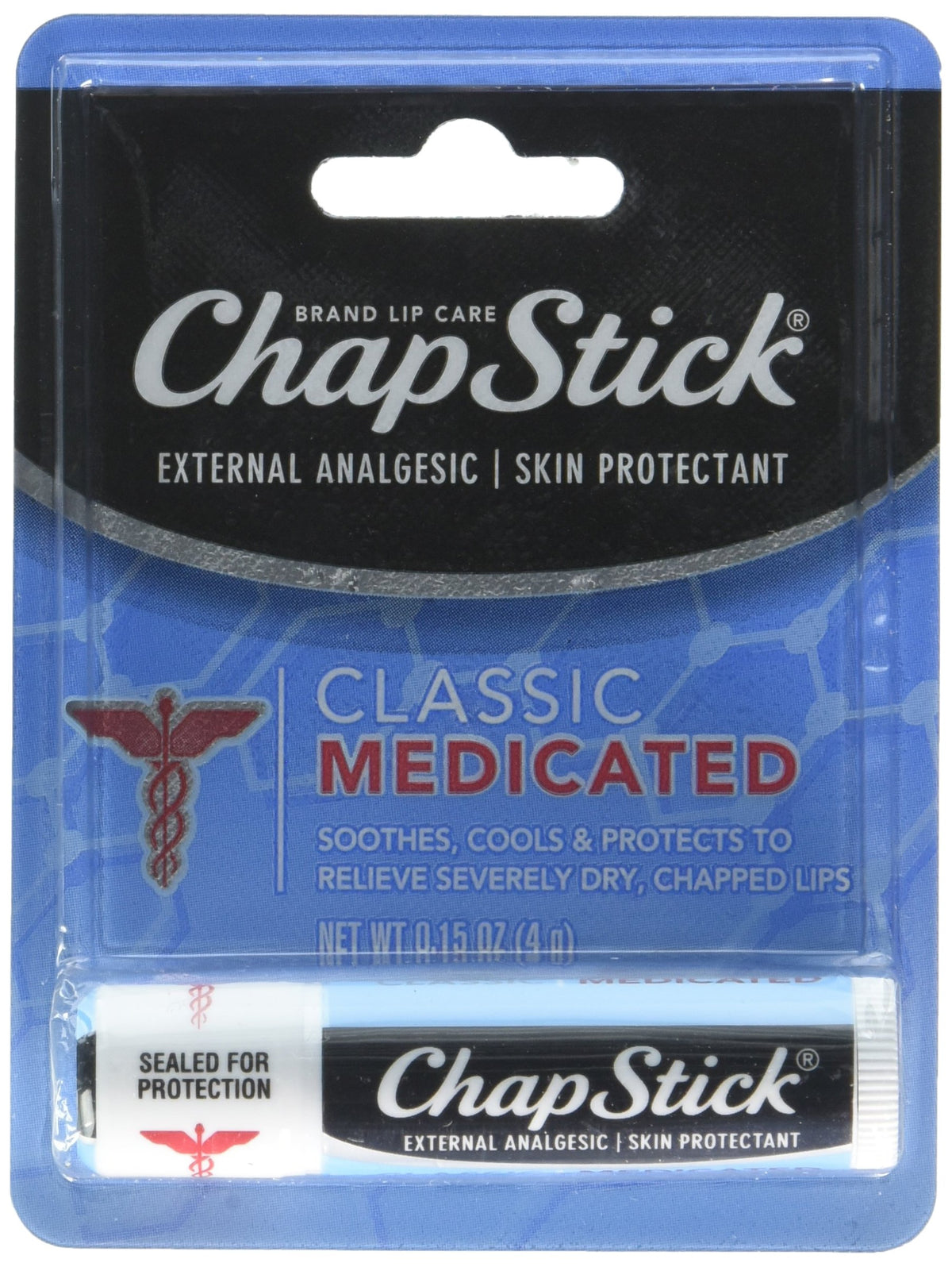 - Q: What are the benefits of using Chapstick Classic Medicated Lip Balm? A: Chapstick Classic Medicated Lip Balm provides serious year-round protection and moisturization for your lips. It contains external analgesics that help alleviate discomfort from chapped or dry lips while acting as a skin protectant.