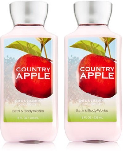 Bath and Body Works 2-pack Country Apple Body Lotion. 8 ounce each. Made with shea butter and coconut oil. Fragrance notes: apple blossom, fresh muguet, sheer sunlight and orchard woods. (Bottle Artwork/Color May Vary as Seasonally Refreshed by Manufacturer).