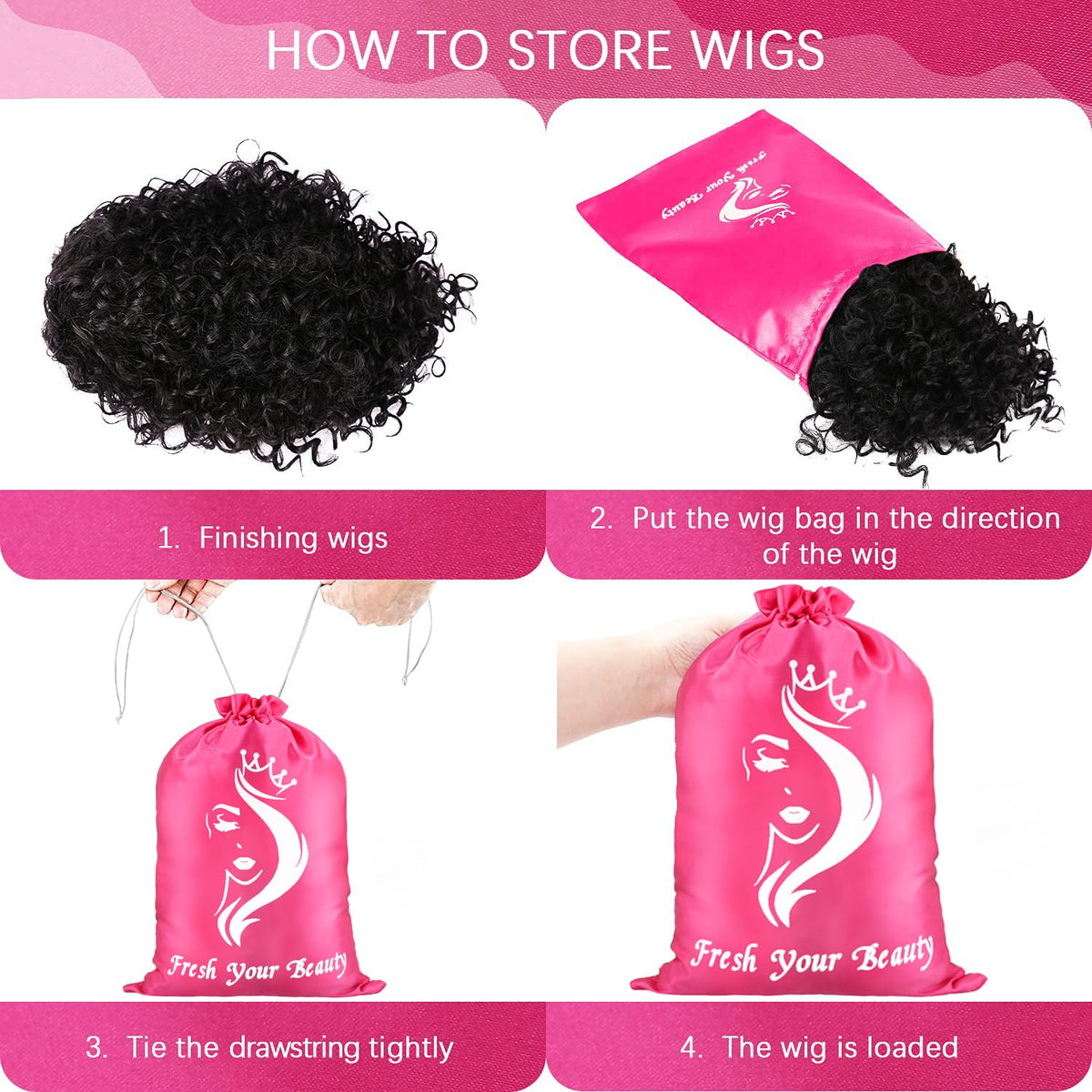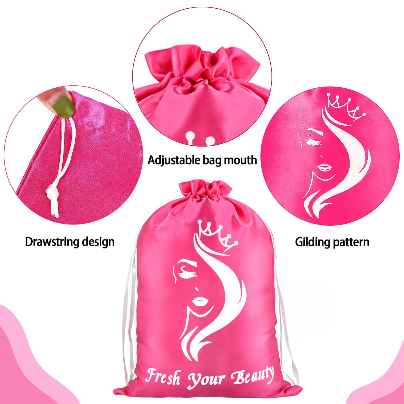 Remium Material: The satin bags for hair bundles made of qulity silky satin ,avoid static electricity,very healthy for hair storage ,packaging and travel.Definitely avoid some frizziness! | Save space:It is the best way to store your wigs as they seem to dry out sitting on wig stands for extended periods of time. These bags are soft and made of thick quality material. there is enough space to store 5-8 bundles or 3 wigs in one bag, depending on length and density. the bag can store them neatly and gain space by removing wig heads. | Multifunctional:You can get a lot of things into the bags with the very big size, not only the gifts, but also the daily small clothes, needle things or used as the knitting organization bag. It is perfect for hair bundles, wigs, gift wrapping, kitting bags, toys, small clothes bags, birthday, parties, celebrations, business and so on. | Rope drawing design:there are drawstrings on both sides of the wig bag, which are easy to open and close; The design of drawstrings makes the bag look more beautiful and can also load or take out items well, is a good helper for our travel or daily use. | Idea Gift: This wig bags is an ideal surprise you can plan to gift your girlfriend this Christmas, Thanksgiving day, Valentine's Day, or Mother's Day who loves dressing up and partying. It is a perfect hair extensions carrier solution for even those whose job is to carry hair extension often during travel.