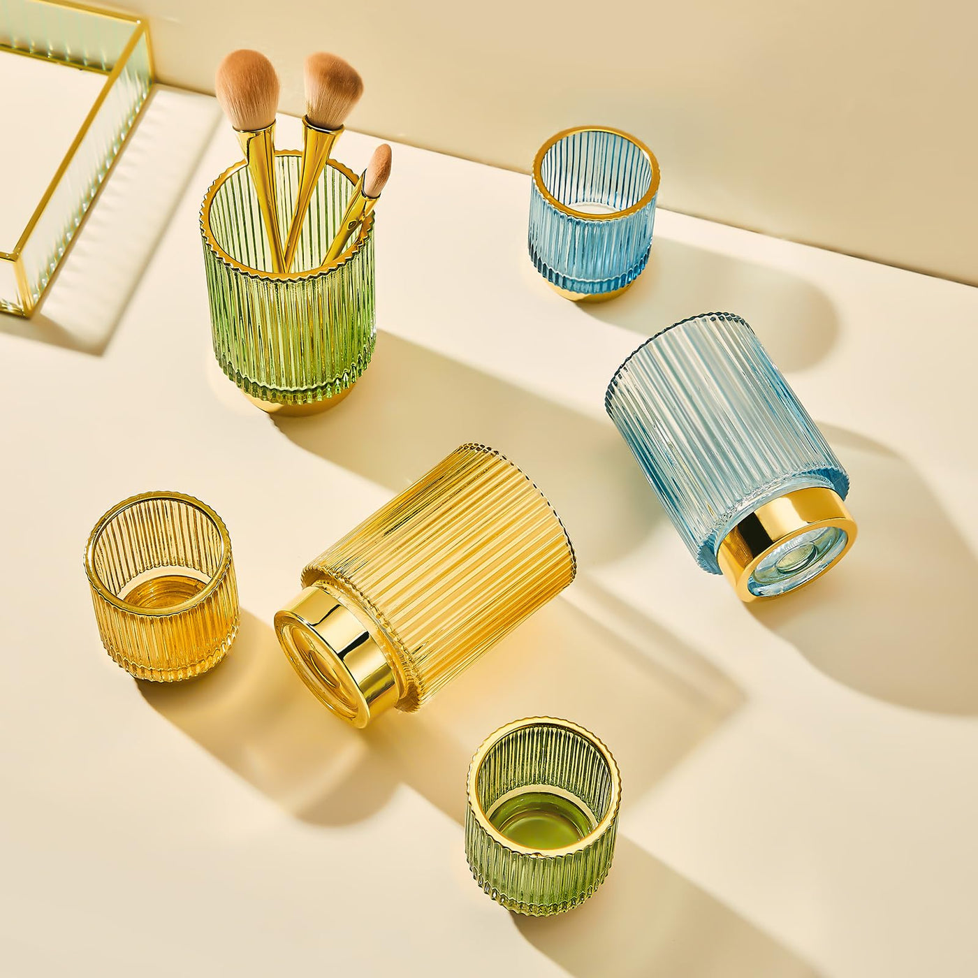 - Q: What materials are used in the LEICURACE Makeup Brush Holder Organizer? A: The LEICURACE Makeup Brush Holder is crafted from high-quality glass combined with a durable golden metal base, ensuring both style and longevity.