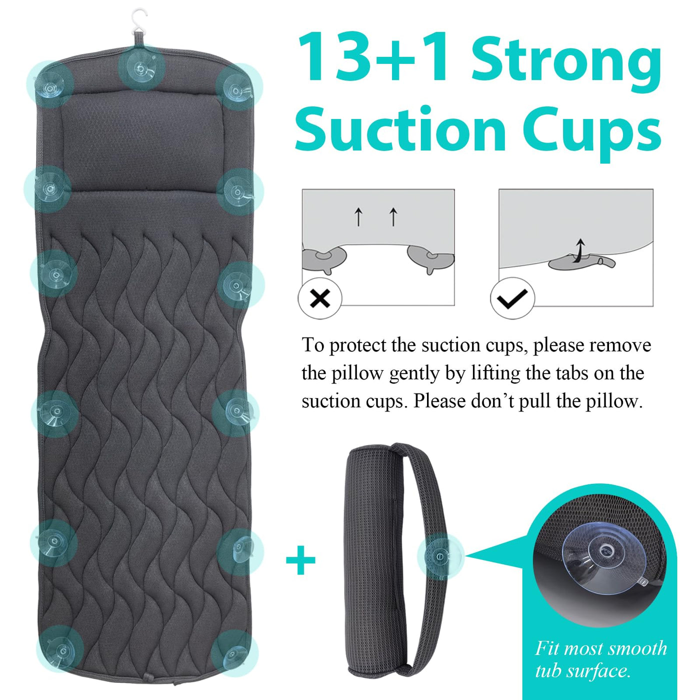 • Q: What materials are used in the construction of the bath pillow? A: The bath pillow is made from a soft and breathable 3D air mesh material, providing comfort and support, along with strong suction cups for a stable experience.