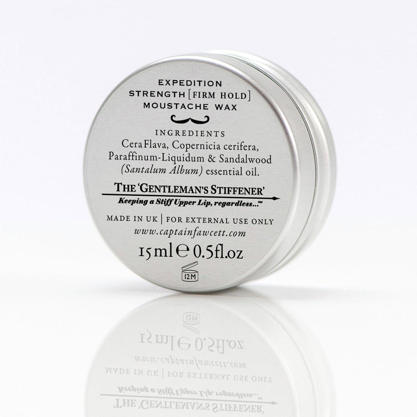 For the gentleman requiring a rather firmer hold...ideal for Keeping A Stiff Upper Lip Regardlesswhen visiting the Tropics or surviving an unscheduled encounter with the Mother-in-Law. Featuring the time-honoured, delectable and most popular Sandalwood fragrance, this tin of specially formulated 'Firm Hold' Expedition Strength Moustache wax will ensure your perky tips stand proud throughout! Huzzah! Supplied in an aluminium tin with a screw top lid. Quantity:15ml e 0.5fl oz How to apply Top tips for Keeping A Stiff Upper Lip Regardless Keep wax warm in either a waistcoat or trouser pocket. Use the back of your finger nail to remove a small amount of wax from the tin. Soften wax between thumb and forefinger, smooth into your moustache in an outwards & upwards motion. With your tips now perky, add a smidgeon of wax in a final twisting flourish, thus ensuring a tip top finish. Ingredients Cera Flava, Copernicia cerifera, Paraffinum-Liquidum & Australian Sandalwood Santalum spicatum essential oil.