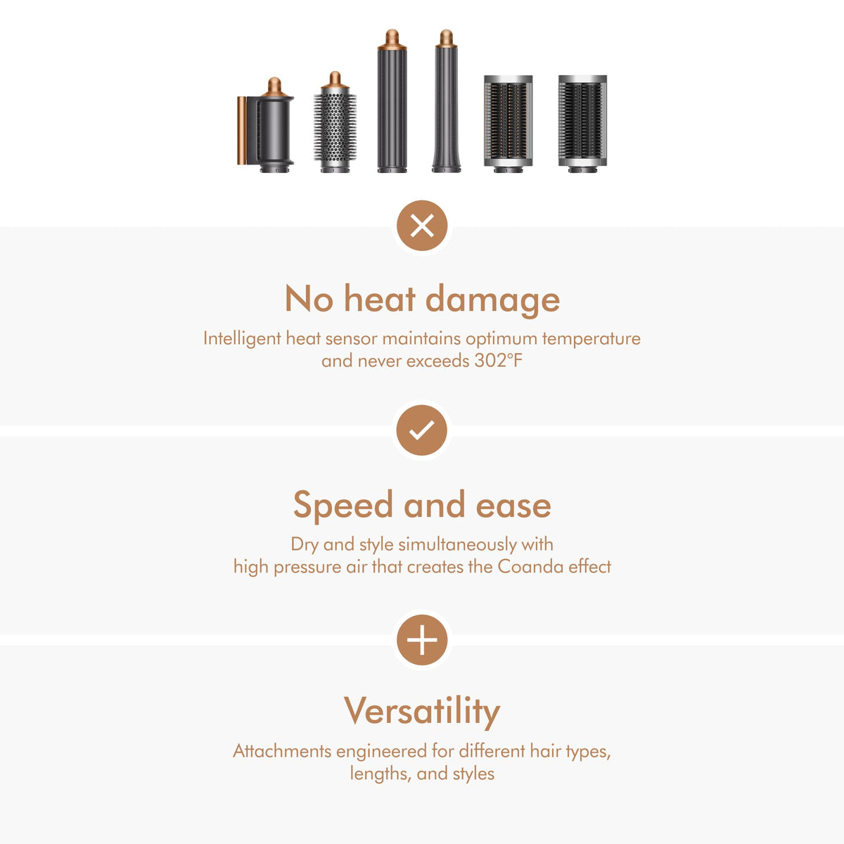 The Dyson Airwrap multi-styler is engineered for multiple hair types and styles. This set comes with 1.2-inch and 1.6-inch barrels to curl and wave hair, and brushes to smooth and volumize, allowing you to dry and style simultaneously. The Dyson Airwrap Complete styler has Coanda air technology which allows you to curl, wave, smooth and dry hair without extreme heat.