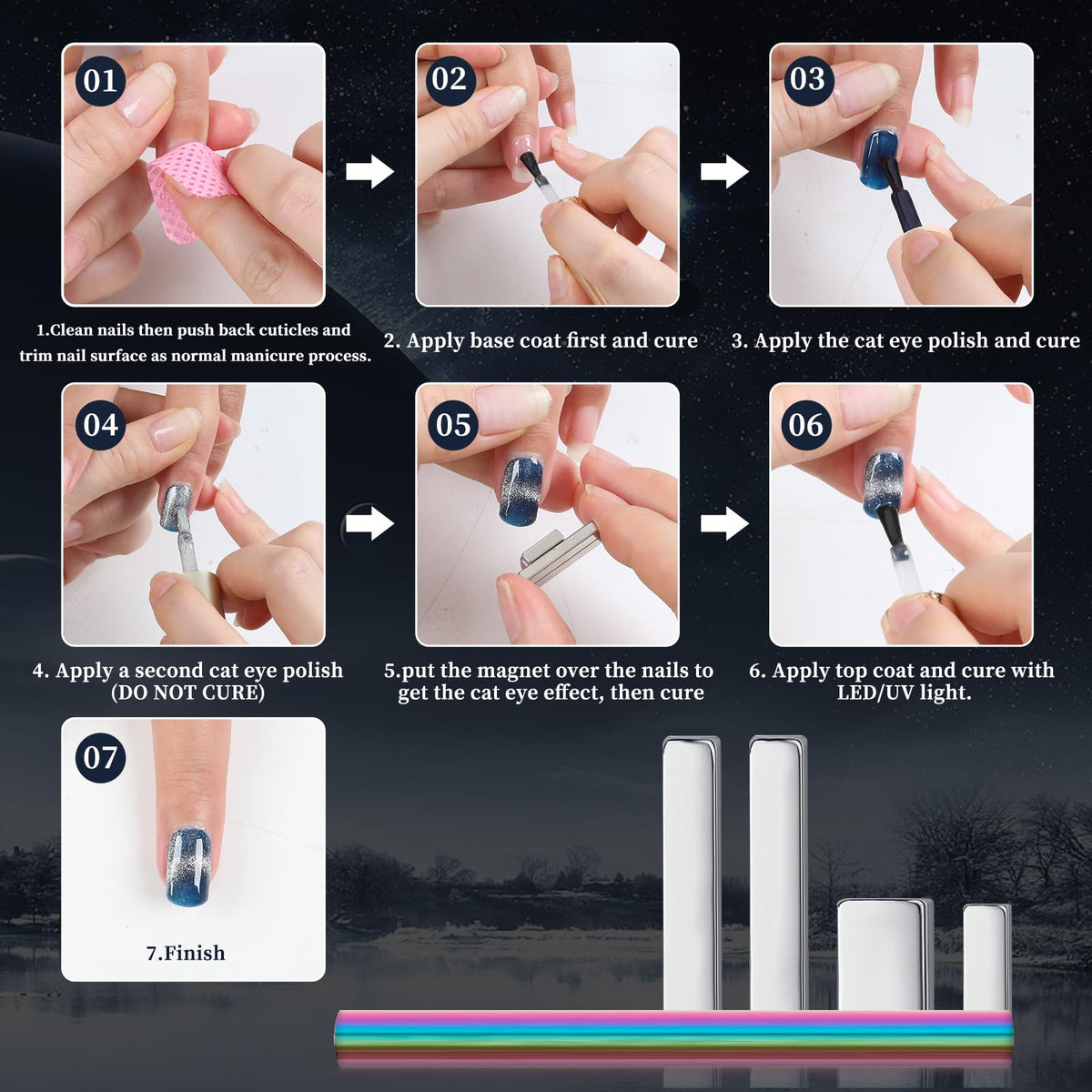 • Q: How do I achieve the best cat eye effect with this magnet? A: To achieve the best cat eye effect, ensure you apply the cat eye gel polish evenly on your nails. Hold the magnet close (but not touching) for the recommended time, and make sure to cure the polish properly under UV or LED light as instructed.