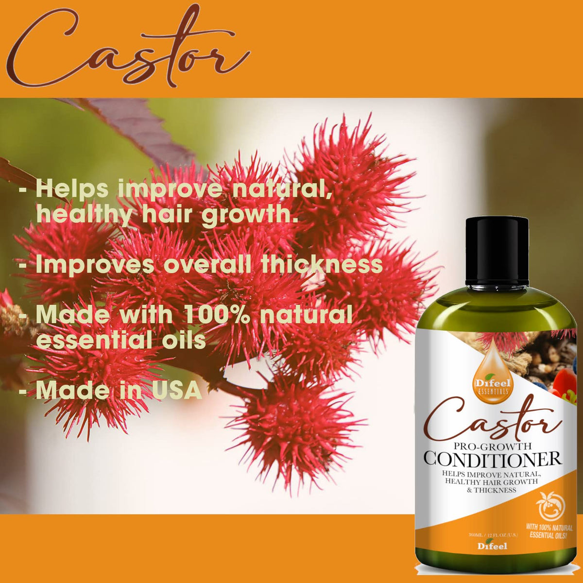 Castor Oil Hair Conditioner - Difeel Castor Pro-Growth Conditioner is a vitamin-rich pro-growth formula for longer, stronger and thicker hair. | Castor Oil Conditioner - Castor oil is a powerful ally in hair re-growth and thickness. | Castor Oil Conditioner for Hair Growth - Difeel Essentials Pro-Growth Castor Conditioner strengthens thin, lifeless hair. Conditions hair & improves scalp health. Moisturizes dry, damaged or brittle hair. | Hair Conditioner for Damaged Hair Sulfate Free - Difeel Essentials hair care products are made with 100% Natural Essential Oils. | Castor Oil Hair Care - Paraben-Free, Sulfate-Free, Phthalate-Free, Formaldehyde-Free, Mineral oil & Dye free. Made in USA