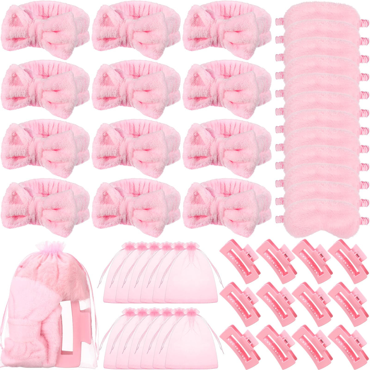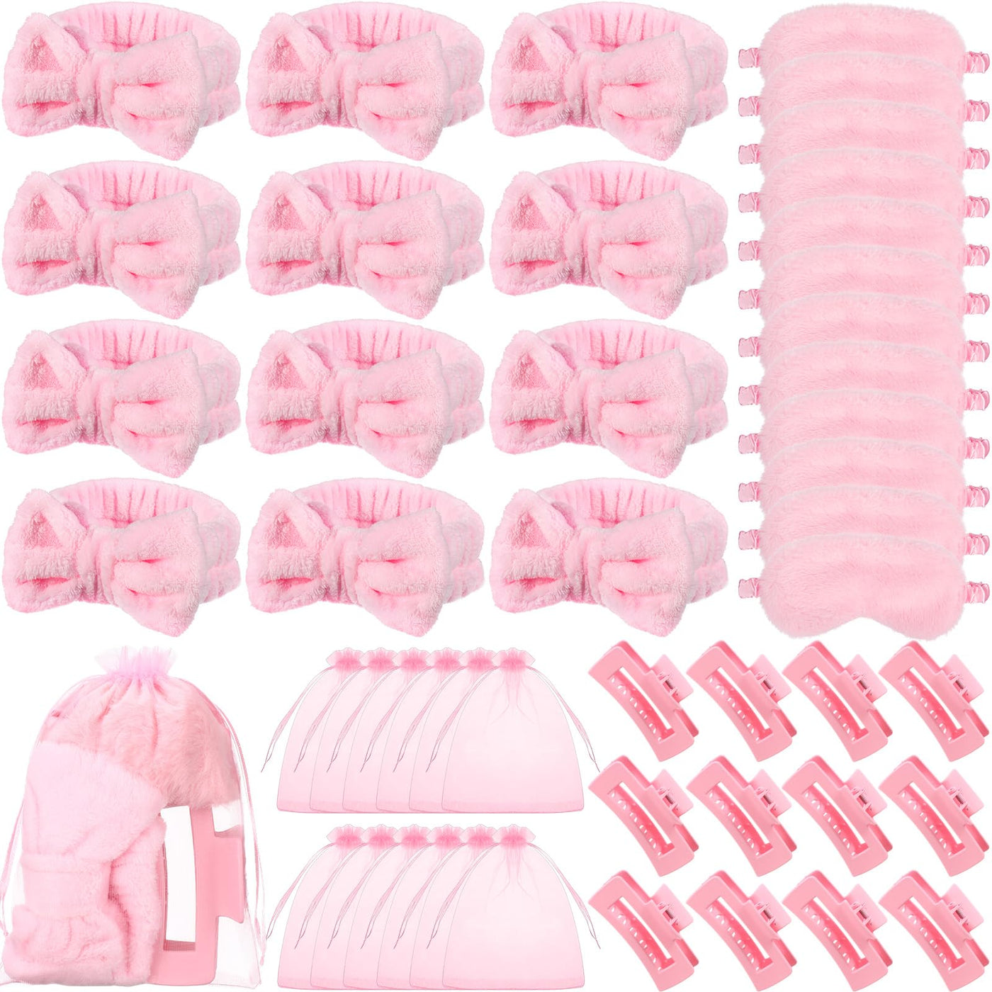 Wavyknot 48 Pcs Spa Party Supplies Sleep over Essentials 12 Pink Spa Headband 12 Pink Plush Sleep Eye Mask 12 Claw Clips 12 Orga
