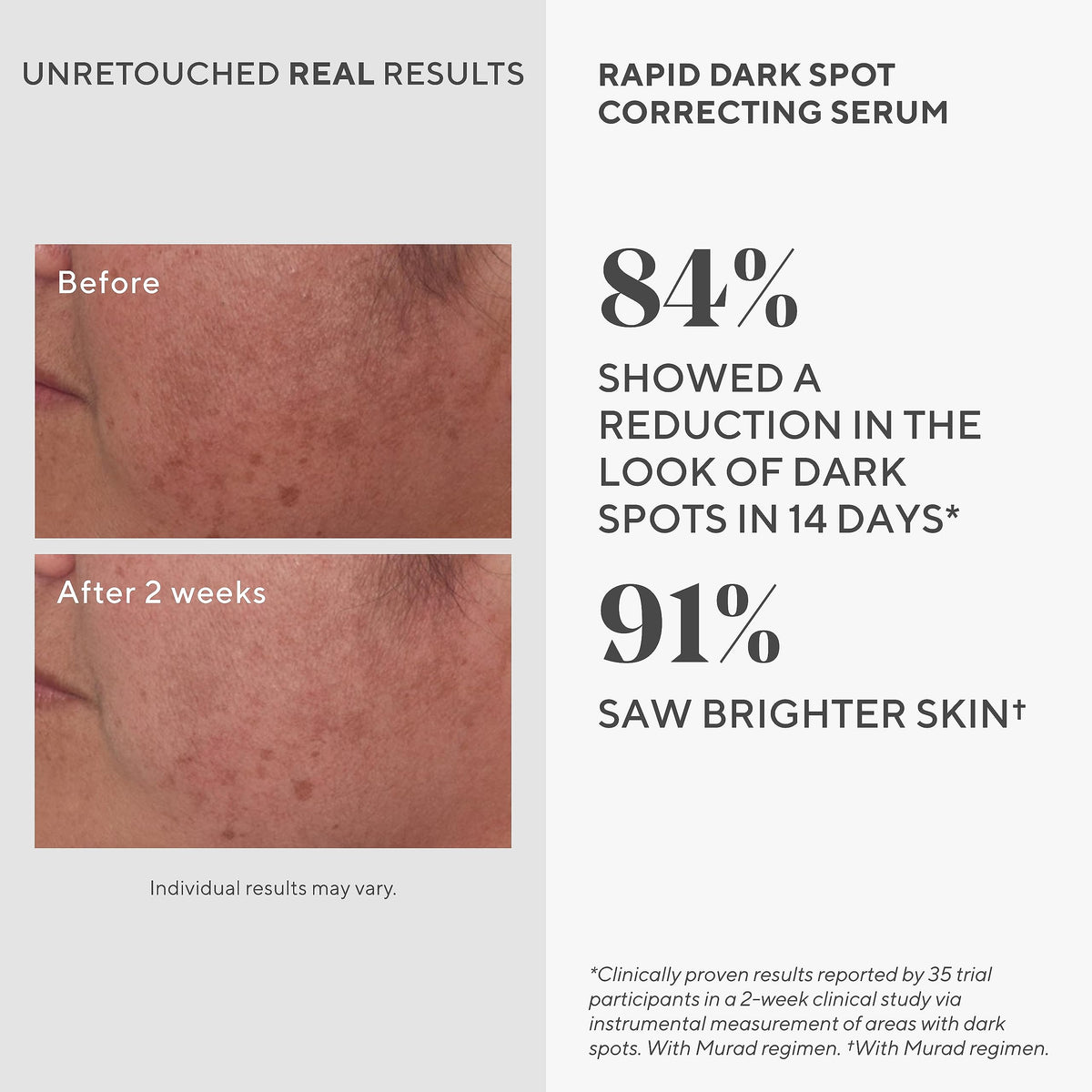 - Q: How quickly can I expect results from the Murad Rapid Dark Spot Correcting Serum? A: You can expect to see visible results in reducing the appearance of dark spots in just 14 days of consistent use.