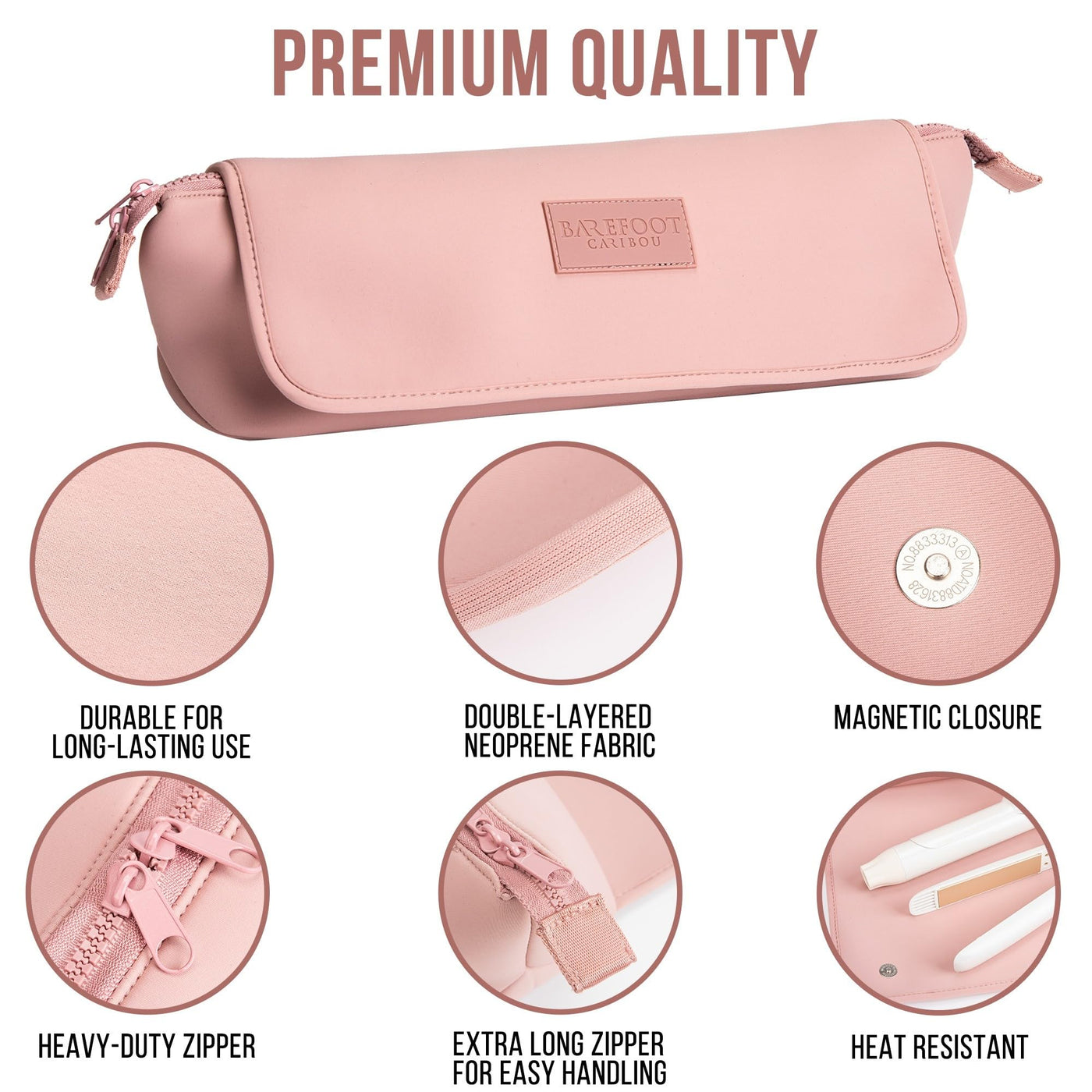 - Q: What materials are used in the BAREFOOT CARIBOU Hair Tools Travel Bag? A: The BAREFOOT CARIBOU Hair Tools Travel Bag is made from heavy-duty neoprene, which is known for its durability and heat-resistant properties, ensuring your hair tools are stored safely.