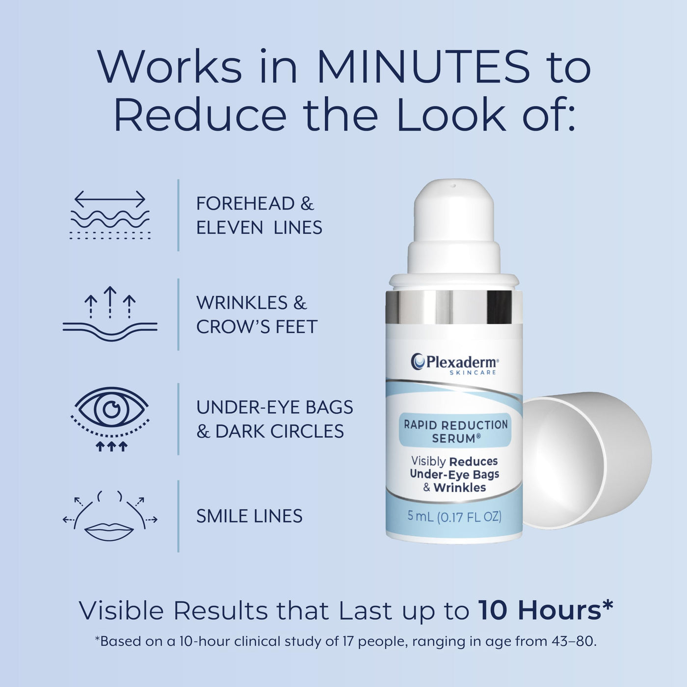 - Q: How quickly can I expect to see results from Plexaderm Rapid Reduction Eye Serum? A: With Plexaderm Rapid Reduction Eye Serum, users can see visible results in as little as 10 minutes. The serum is designed to reduce under-eye bags, dark circles, and wrinkles quickly, providing an instant lift and youthful appearance.