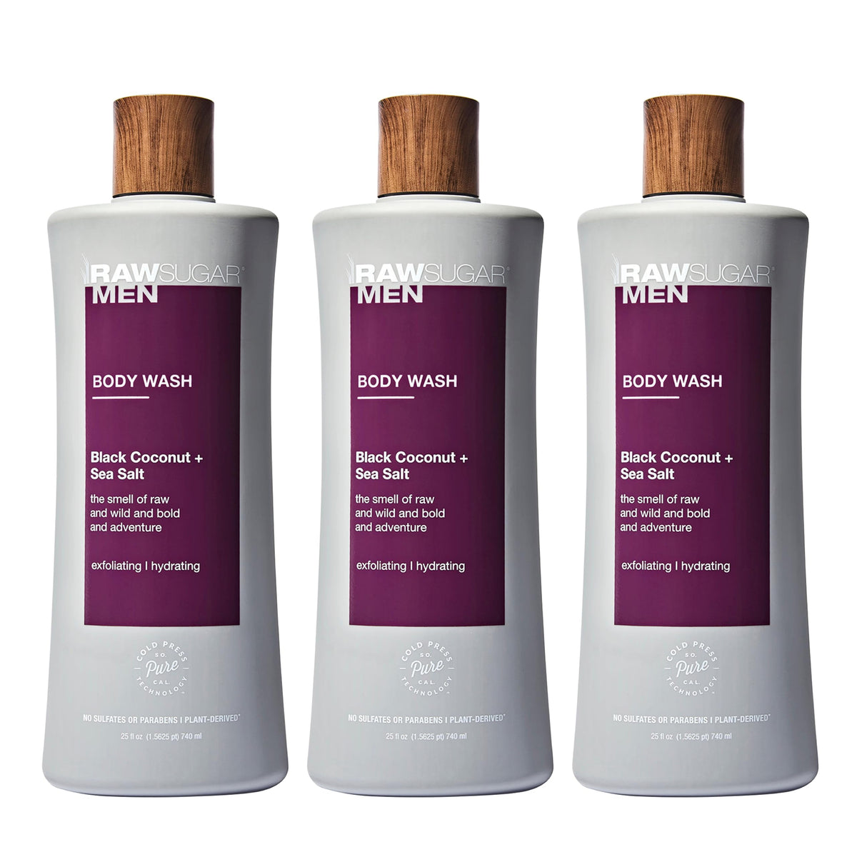 Raw Sugar 3-Pack Body Wash Men - Black Coconut + Sea Salt Exfoliating And Hydrating Body Wash, Formulated Without Parabens, Crue