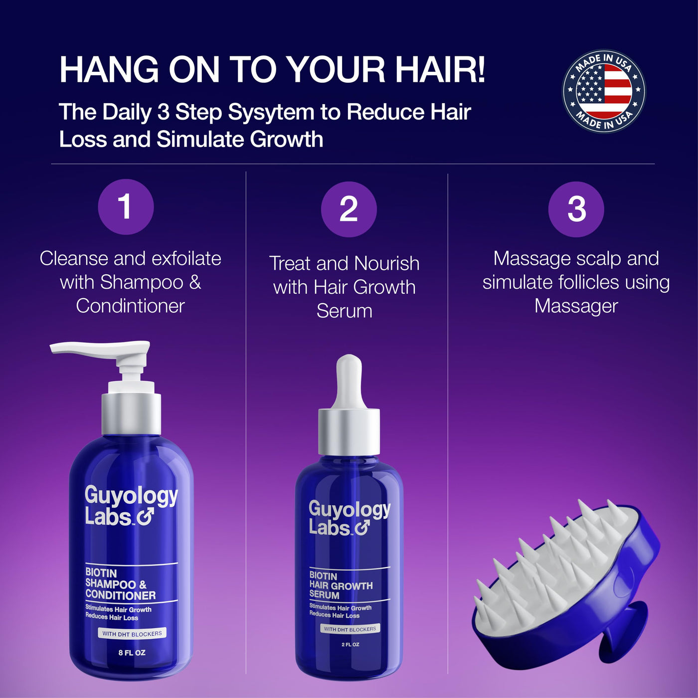 • Q: How does the Guyology Labs Head Massager promote hair growth? A: The Guyology Labs Head Massager stimulates the scalp and hair follicles, helping to remove DHT buildup, which is a primary cause of hair loss. It promotes blood circulation and oxygenates hair follicles, potentially leading to improved hair growth and thickness.