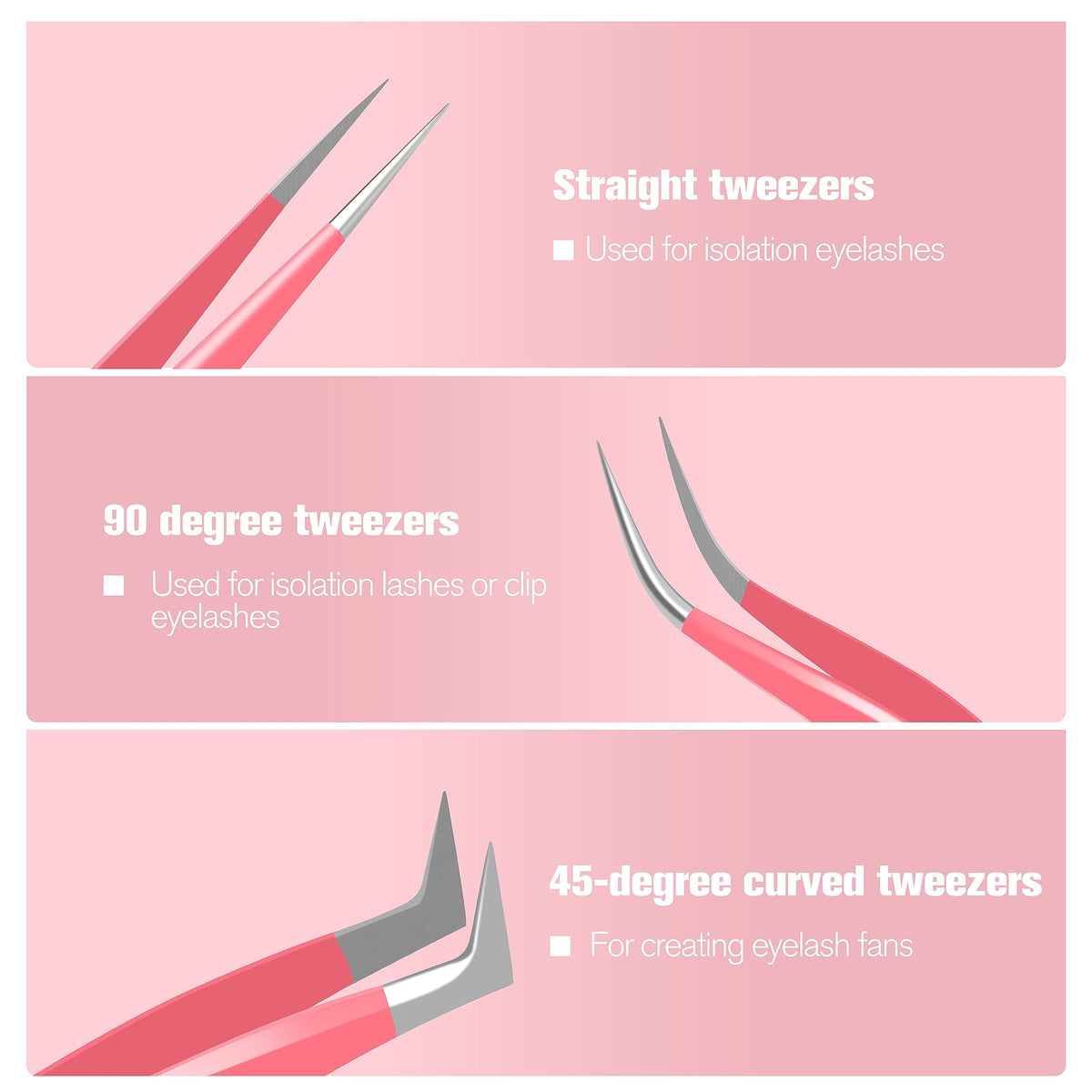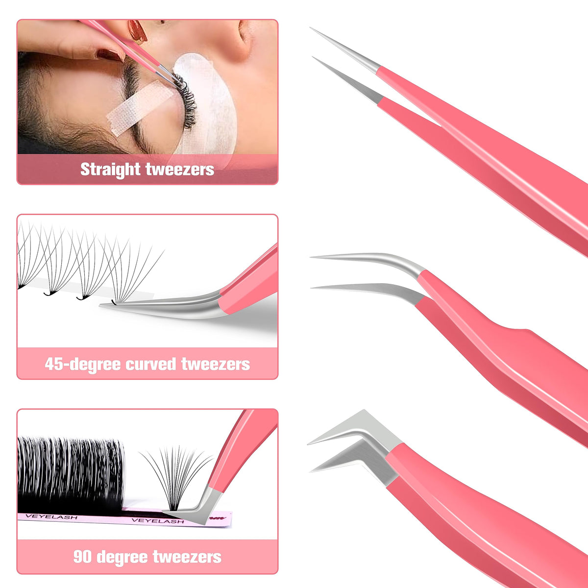Veyes Inc Lash Tweezers For Eyelash Extensions. Fiber Tip Tweezers Kit Contains Isolation,Curved And Volume Lash Tweezers (3Pcs)