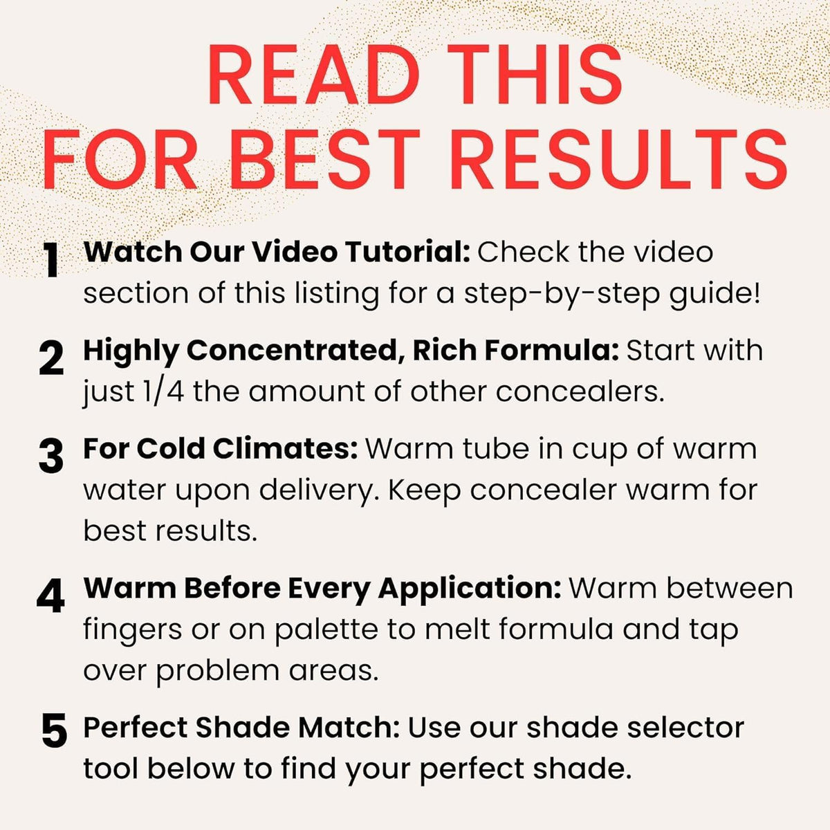 • Q: How do I apply Fièra Luxury Concealer for the best results? A: For optimal application, use only 1/4 the amount of typical concealers. Warm the product on your fingers or a palette until it melts for a flawless finish. Consider using our shade selector tool to find your perfect match.
